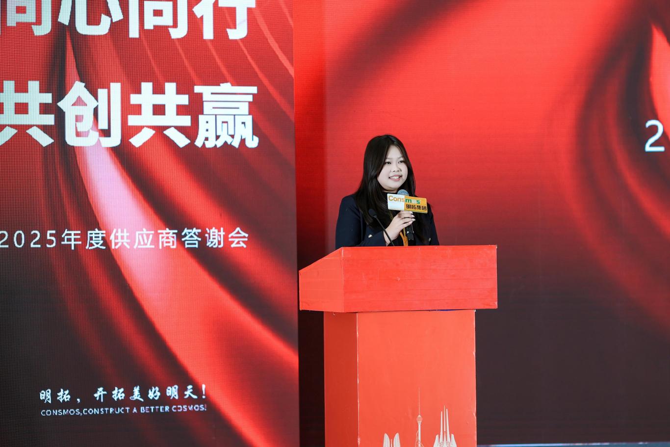 下午 15:00,大会在激昂的音乐中正式拉开帷幕。明拓集团董事长张少龙发表致辞,向莅临现场的政府领导、供应商伙伴致以最热烈的欢迎与最诚挚的感谢。他回顾了明拓 15 年来从青涩起步到稳步领跑的发展历程,强调每一份成绩的取得都离不开供应商伙伴的鼎力支持与精诚协作。